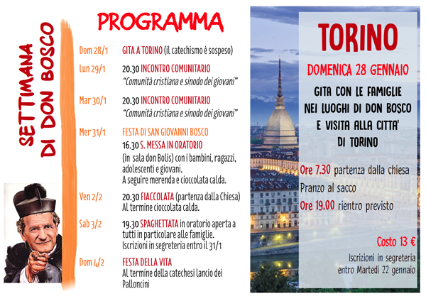 Settimana di Don Bosco 2017 consulta il volantino PDF Invia un link a un amico via e-mail (Si apre in una nuova finestra) E-mail Stampa (Si apre in una nuova finestra) Stampa Pubblicato il 9 Gennaio 2018 da Giuseppe P. in Proposte per tutti