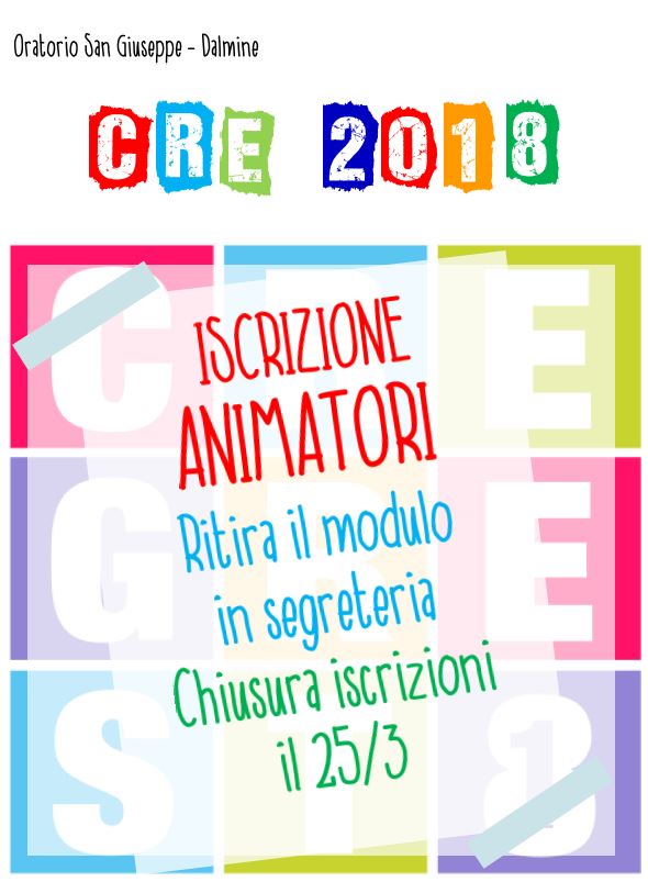 Avviso Iscrizione Animatori del CRE 2018 Invia un link a un amico via e-mail (Si apre in una nuova finestra) E-mail Stampa (Si apre in una nuova finestra) Stampa Pubblicato il 13 Marzo 2018 da Segreteria OSG in Comunità in rete