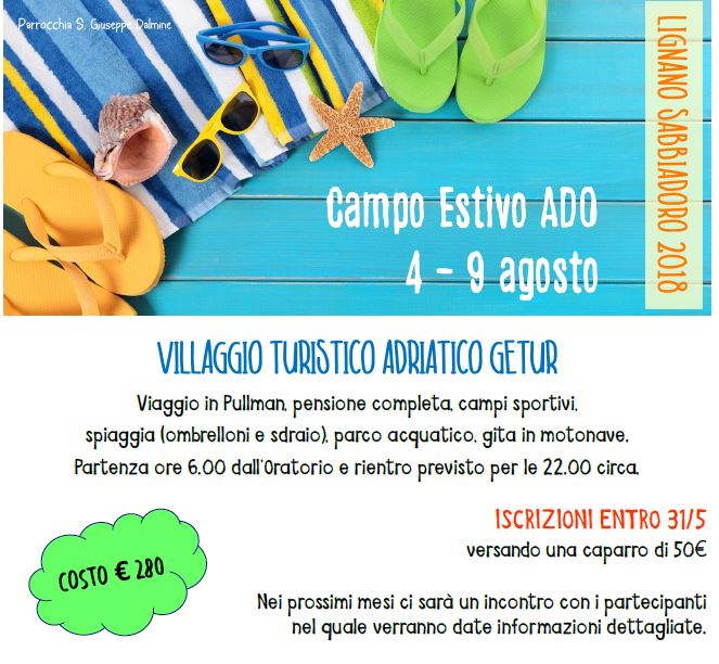 Campo estivo adolescenti ,aprite il volantino allegato ed iscrivetevi presso la segreteria dell’oratorio volantino-lignano-2018 Invia un link a un amico via e-mail (Si apre in una nuova finestra) E-mail Stampa (Si apre in una nuova finestra) Stampa Pubblicato il 28 Marzo 2018 da Segreteria OSG in Comunità in rete, Proposte per gli adolescenti, Proposte per i giovani, Proposte per i ragazzi