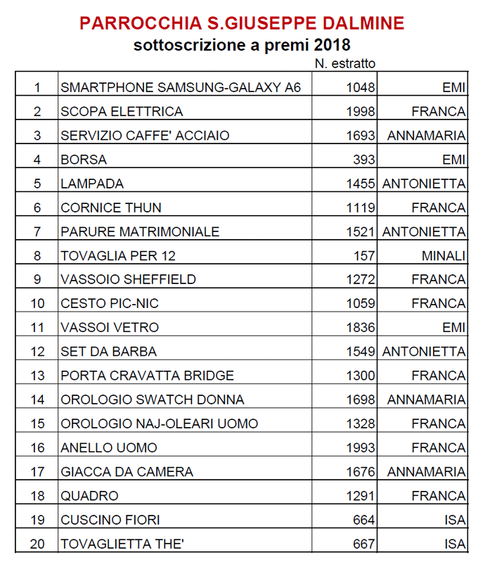 Sottoscrizione a premi della Festa Patronale: i numeri estratti Invia un link a un amico via e-mail (Si apre in una nuova finestra) E-mail Stampa (Si apre in una nuova finestra) Stampa Pubblicato il 15 Ottobre 2018 da Giuseppe P. in Proposte per tutti