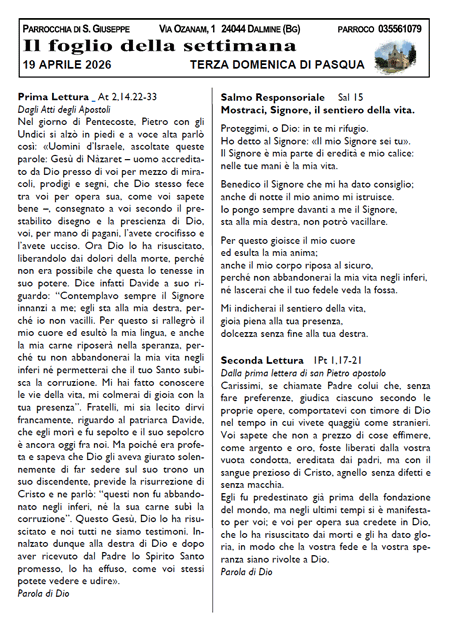Il foglio della settimana dal 19/4/2026 al 26/4/2026 consulta il PDF cliccando sull’immagine Invia un link a un amico via e-mail (Si apre in una nuova finestra) E-mail Stampa (Si apre in una nuova finestra) Stampa Pubblicato il 17 Aprile 2026 da Giuseppe P. in Il foglio della settimana